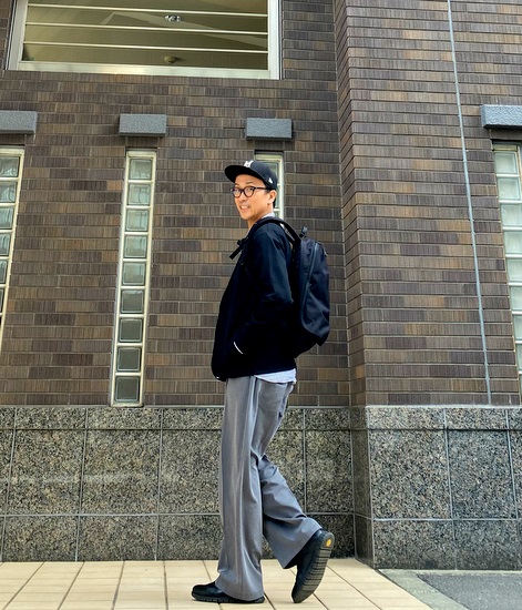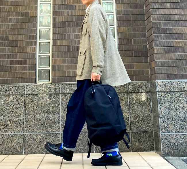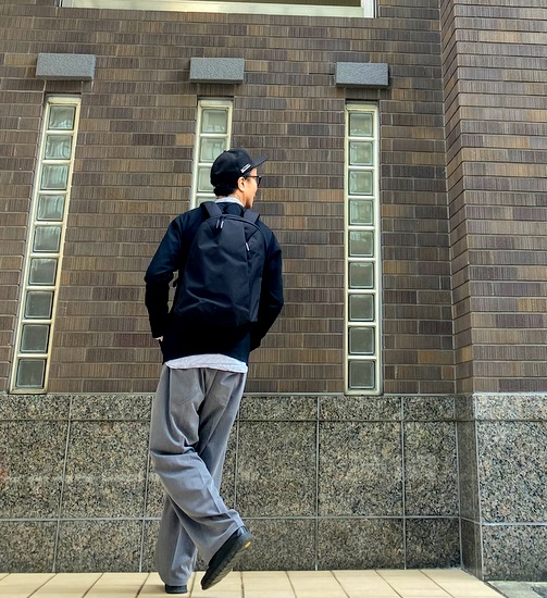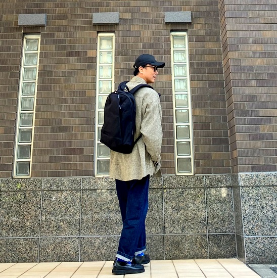 機能的でデザイン性の高いスタイリッシュなバックパックです。ナクールが提案する大人カジュアルのスタイリングに綺麗に馴染んでいきます。
