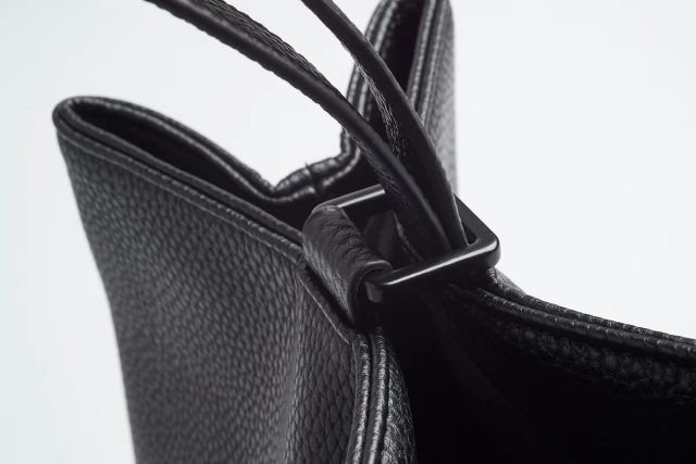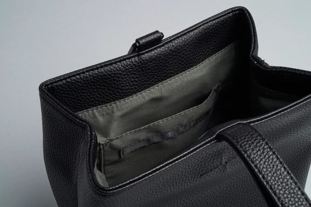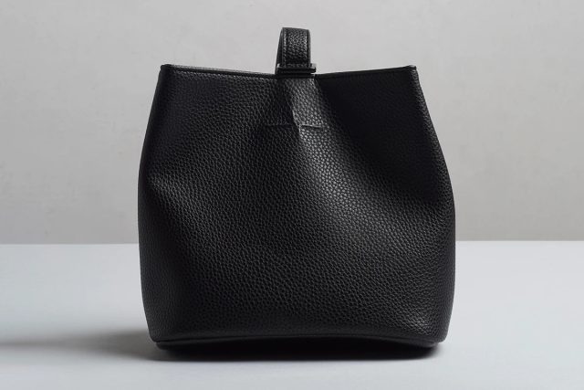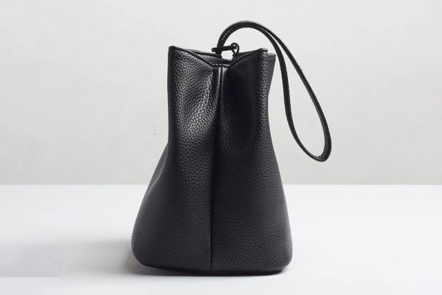 厚みのある底面でバッグの形が歪みずらく机や床に置いても綺麗に自立するのが特徴。持ち手をリングに通すことで上部を開閉するユニークなデザイン。内側にはキーや小物などを入れる為のミニポケットが付属。マチがあり小さいペットボトルなどポケットサイズの小物を複数収納出来るハンドバッグになっています。