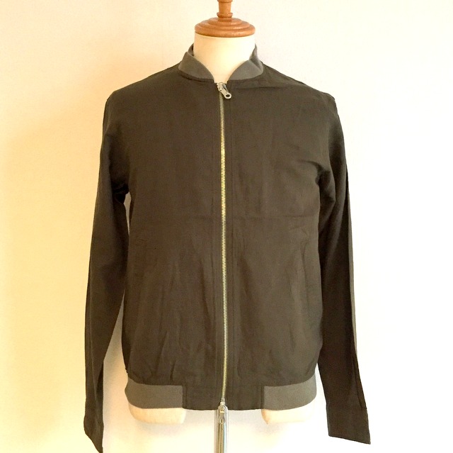 春から初夏、袖を捲れば真夏まで使えるショート丈タイプのブルゾン。かっちりしないでカジュアルにラフに着こなしたいっていうニーズにピッタリな一つの例としての提案がこれです。MA-1タイプのリブが衿と裾についたブルゾン。