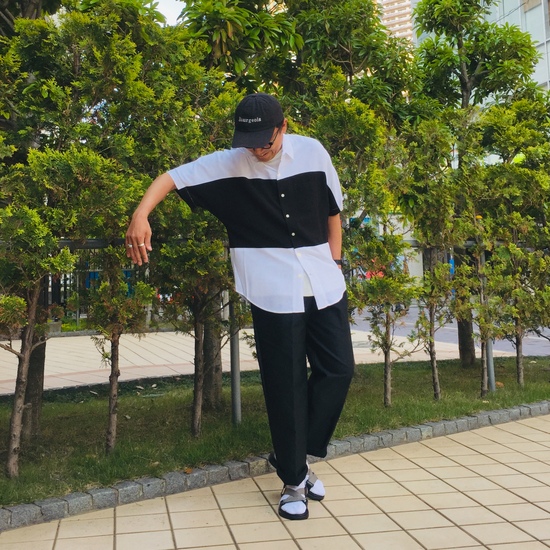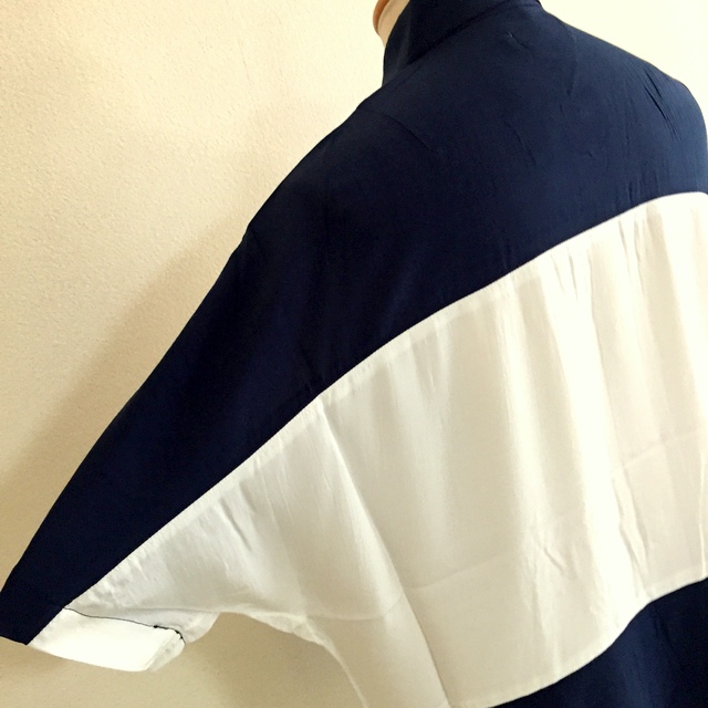 昨年も大ヒットしたこのシャツいきましょう。バンブーレーヨン100%のシャツ地を使用したドルマンスリーブの切り替え配色のシャツ。