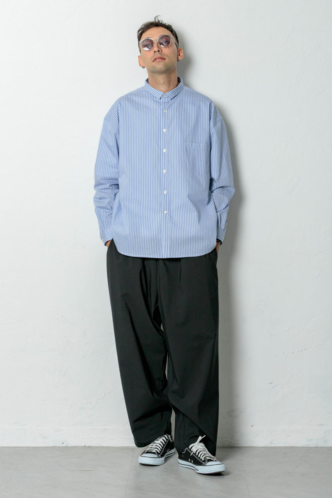 チェック柄プルオーバーシャツ。あまりに着心地抜群なので素肌に着ました。ボトムスをタイトフィットにして、このバランス感覚でいけます。