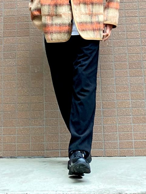 綺麗な表面感で柔らかいのでドレープ感もでます。これも好みが分かれるところですが、リラックスした履き心地を重視するとこちらですね。