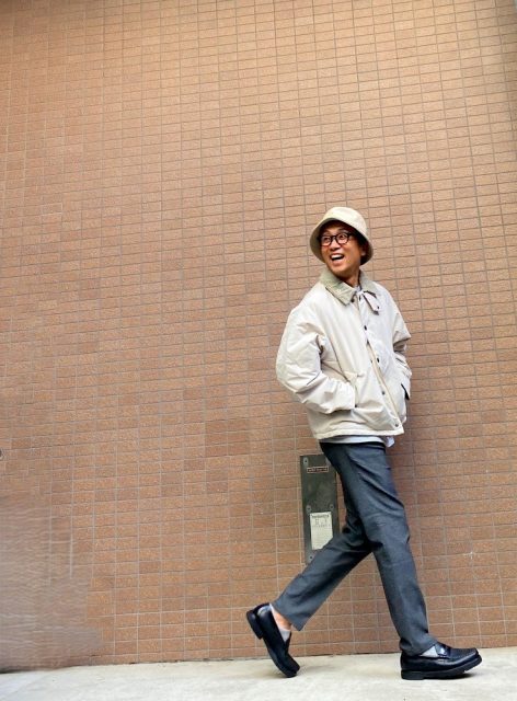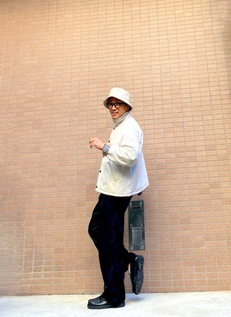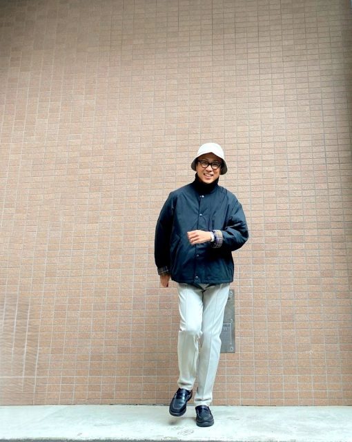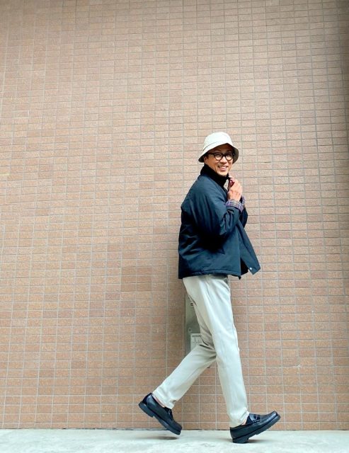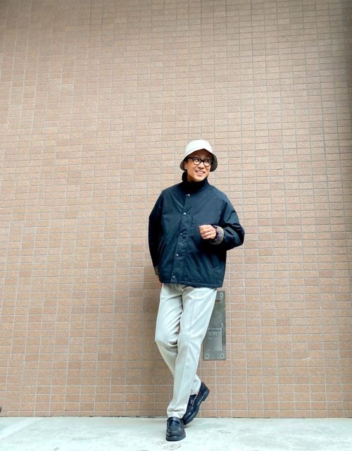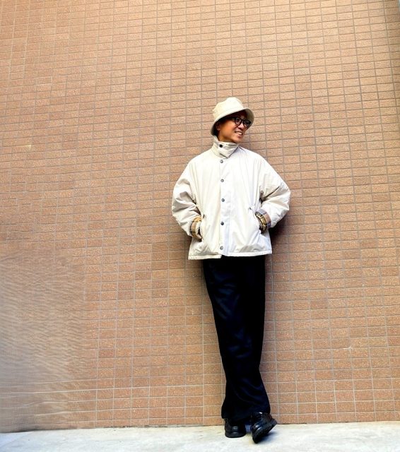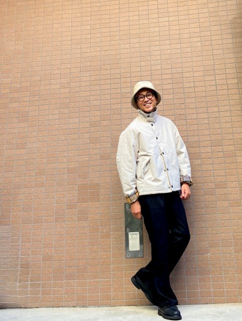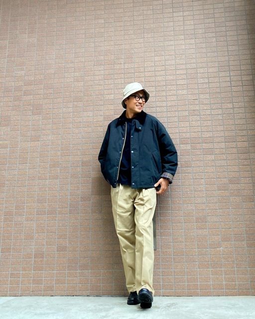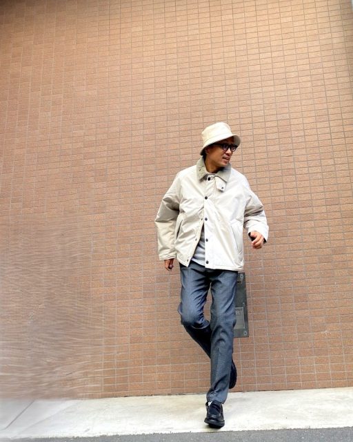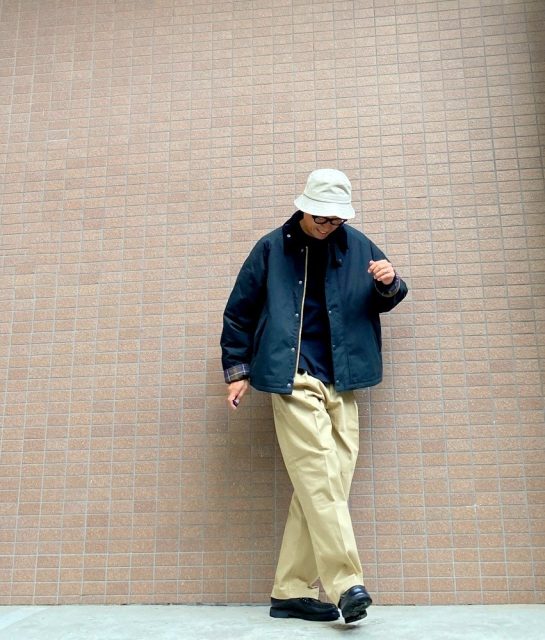 今日はBarbour(バブアー)で人気のカタチ「トランスポート」に中綿を搭載したブルゾンの着装感を確認してください。着丈感が絶妙なので、スリム系のパンツでもワイド系のパンツでもコーディネートできます。そのあたりのバランスをご覧ください。