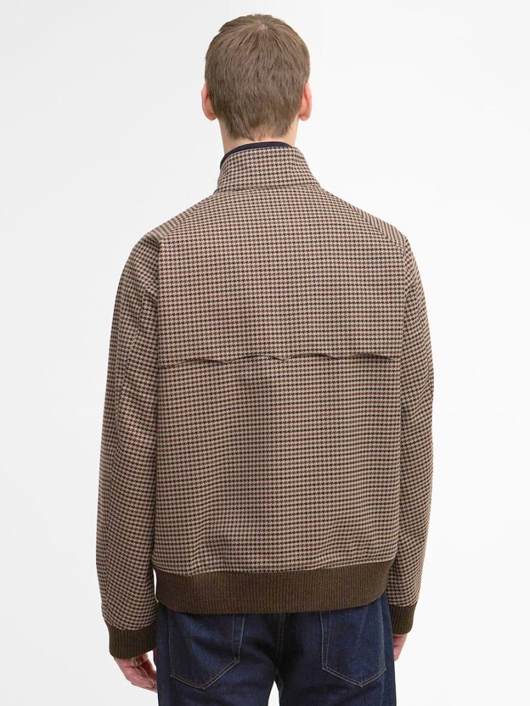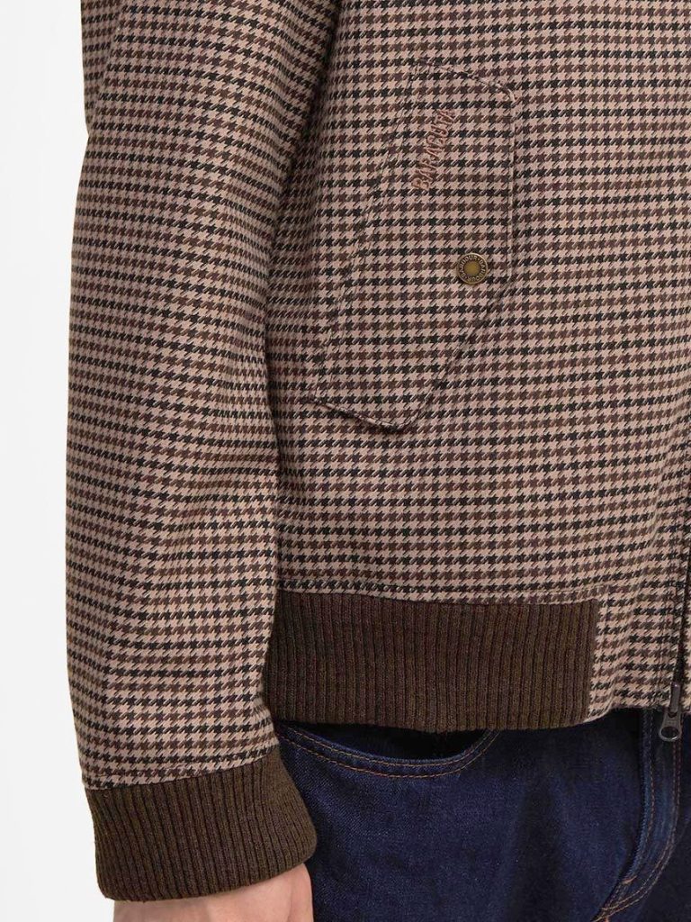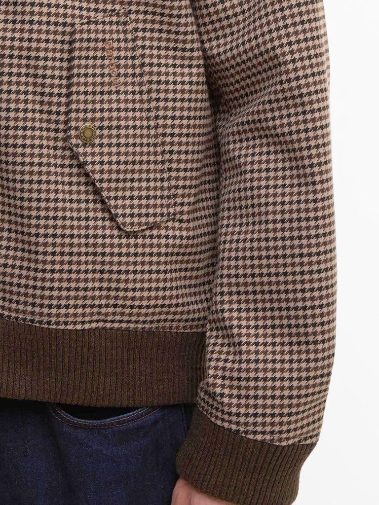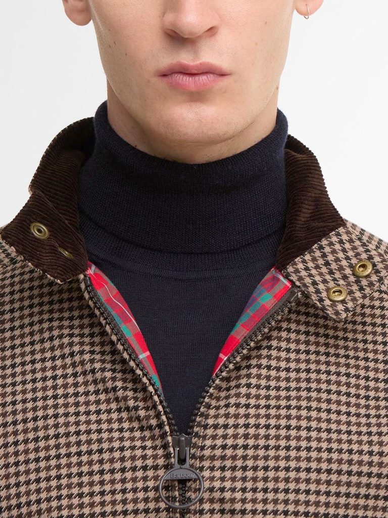 表地には存在感のある千鳥格子柄を採用し、襟裏にはバブアーを象徴する太めの畝のコーデュロイ生地をプラス。