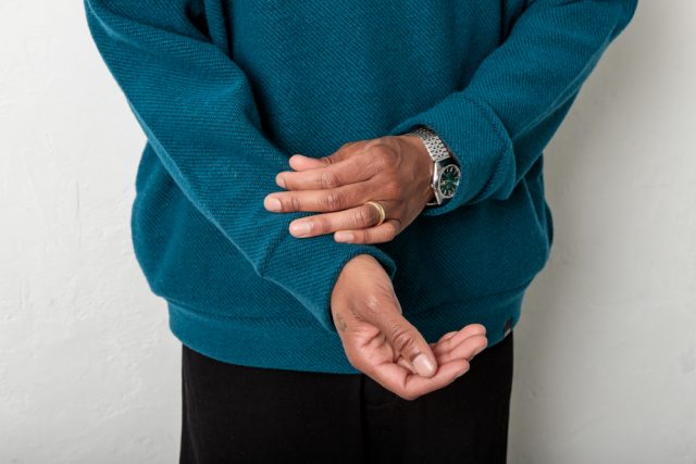 ネックとカフスは共布で作りスッキリした印象に仕立てています。程よい厚みのある生地はニットのような高級感があり、1枚着でもサマになります