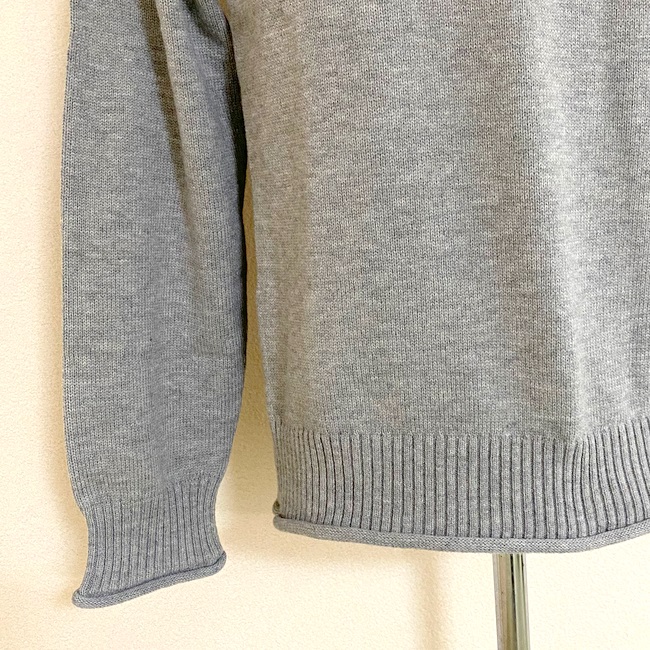 ネックと裾、袖口がリブ編みに切り替わって、くるっと丸まったロール状になっているのが特徴的なニットです。しかも洗えるニット。