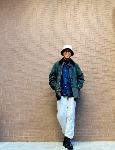 日曜日と同じスウェットパンツにバブアービデイル。コーデのアイデアとしては日曜日と同じ。キャップのときはスニーカー、ハットのときはブーツやレザーシューズ系。