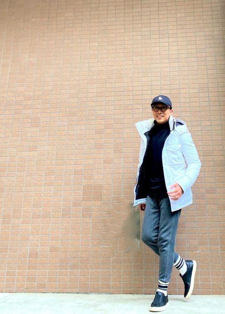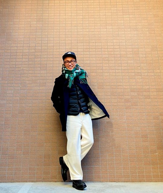 こちらも忘年会イメージのコーデ。Pコート、インナーダウンベストの着こなし