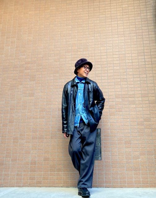 これも忘年会コーデを意識しました。ニットタートル、Gジャンインナー使いでレザーカバーオールジャケット。