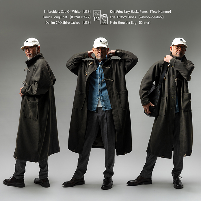 耕太さん、忙しいところモデル協力ありがとうございました! そして、写真道場、久門さん、女将の金森さん、今年もよろしくお願いいたします! 今回のコーディネートアイテムはこちらです ・Smock Long Coat 【ROYAL NAVY】/28600- ・Denim CPO Shirts Jacket 【LiSS】/19800- ・Knit Print Easy Slacks Pants 【Tete Homme】/15400- ・Oval Oxford Shoes 【whoop’-de-doo’】/23980- ・Plain Shoulder Bag 【Drifter】/6600- ・LiSS Embroidery Cap 【LiSS】/5280-
