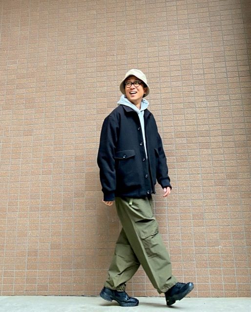 雨風を凌ぐだけでなく、秋冬の体温調節にも便利です。裾のドローコードを絞ったスタイリングがおすすめです。