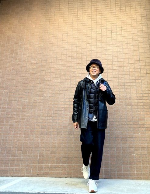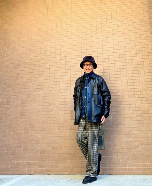 ラムレザーカバーオールジャケット完売です。ありがとうございました!タートルネックニット+Gジャンにレイヤード(重ね着)
