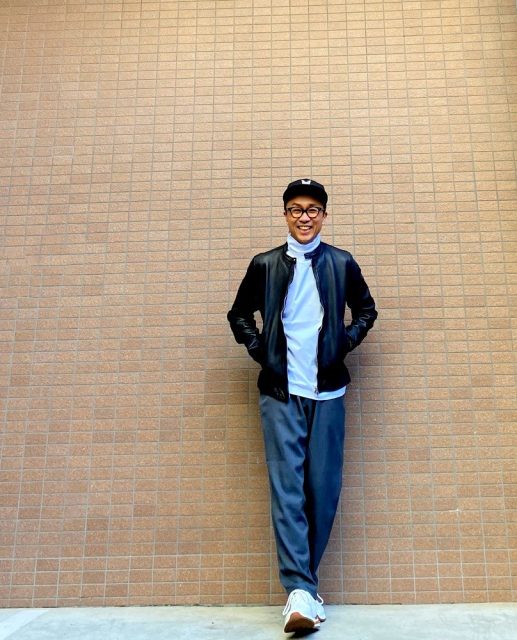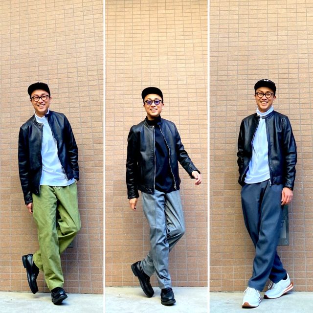 レザーブルゾンはハードなイメージ、バイカーのイメージが強いかもしれませんが、ナクールが提案する着こなしはあくまで品よくかっこよくがテーマです。