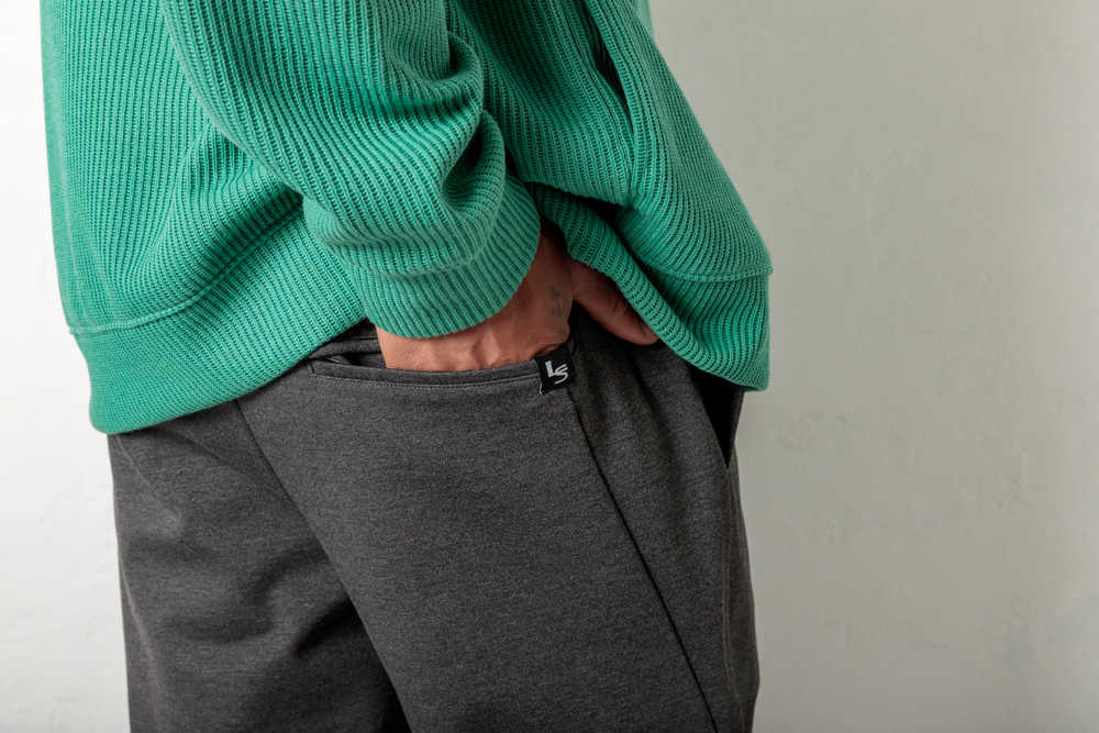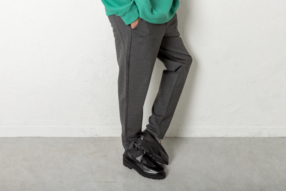 滑らかで、きれいめな印象を与えるポンチ素材のイージースラックスパンツ。軽くて柔らかい履き心地が魅力の1本です。関口さんにはチャコールグレーを購入してもらっています。
