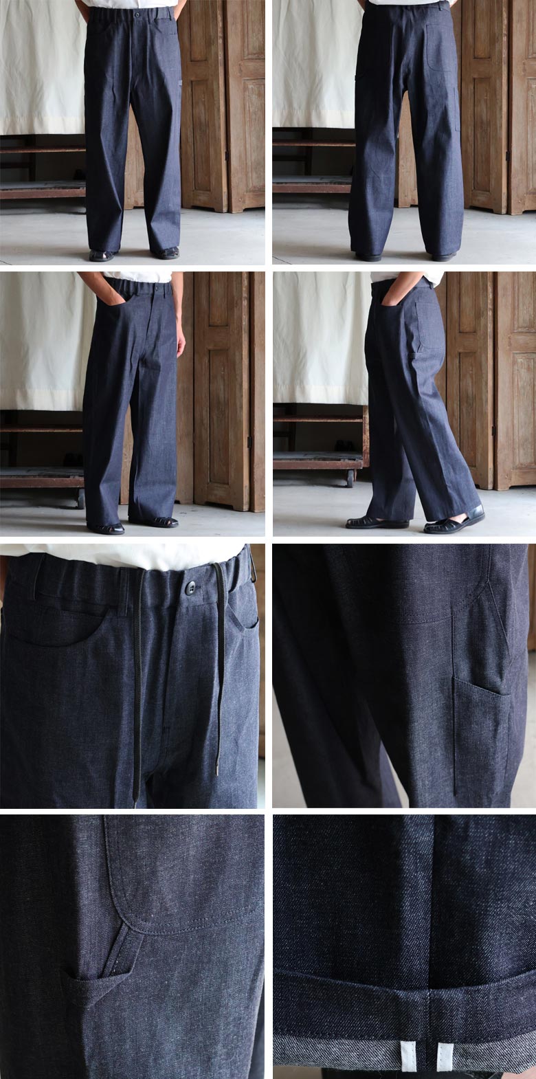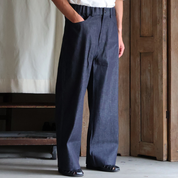 「備後」8オンス ムラデニム ワイド イージーペインターパンツ!夏場でも穿けるフルレングスデニムです。ショートパンツは苦手です、という大人にピッタリの8オンスデニム!軽い履き心地はデニムパンツの概念を崩す1本でしょう。上下で買って、下だけたくさん履いて色が違ってきちゃったってことのないように(笑)デニムセットアップあるあるです。ディティールをご覧ください。
