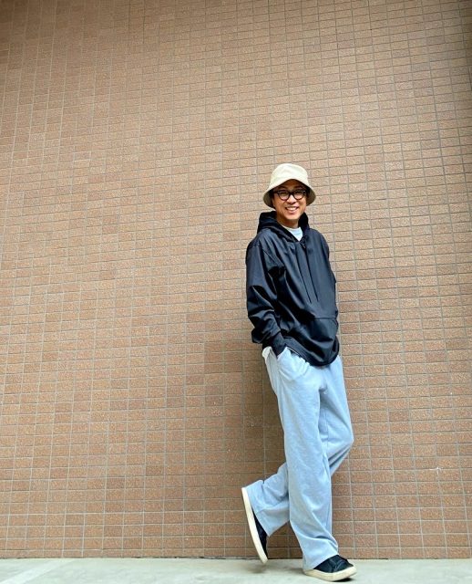 裏毛スウェット素材のパーカーよりはスッキリと見える素材感とフォルム。生地感としても厚めなロンTEEくらいの厚さですので初夏までも使える1枚です。