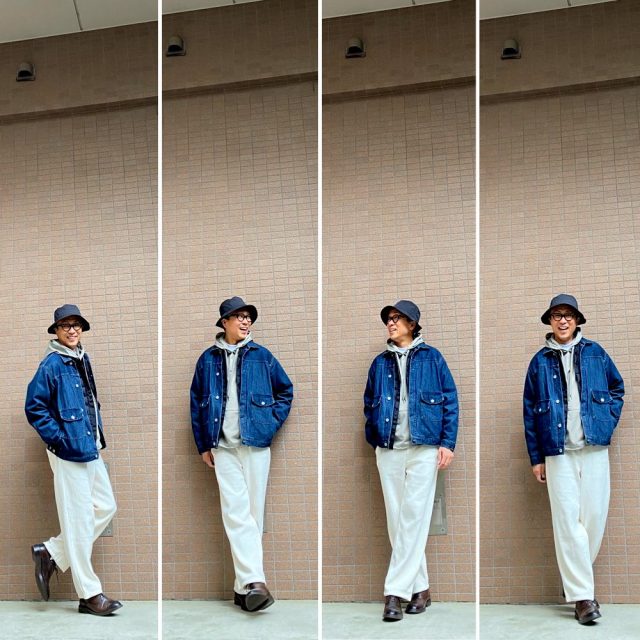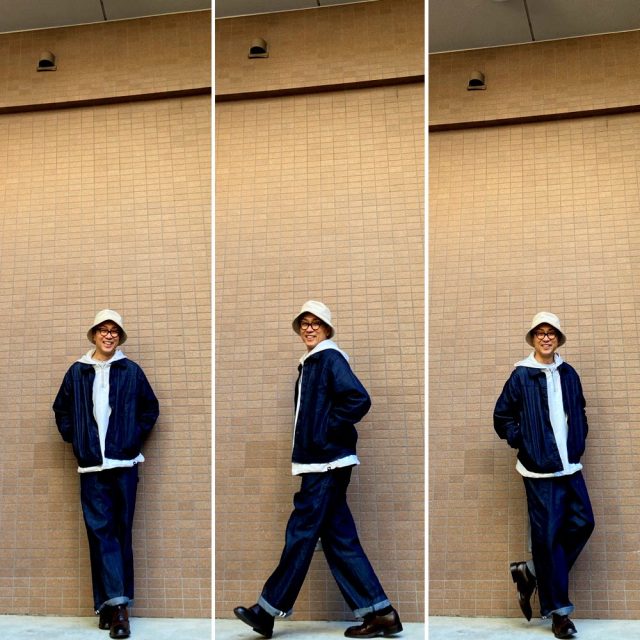 デニムのセットアップ人気です!Mサイズのみ1組で完売です。合わせてるフーディーは黒、カーキなら在庫あります。