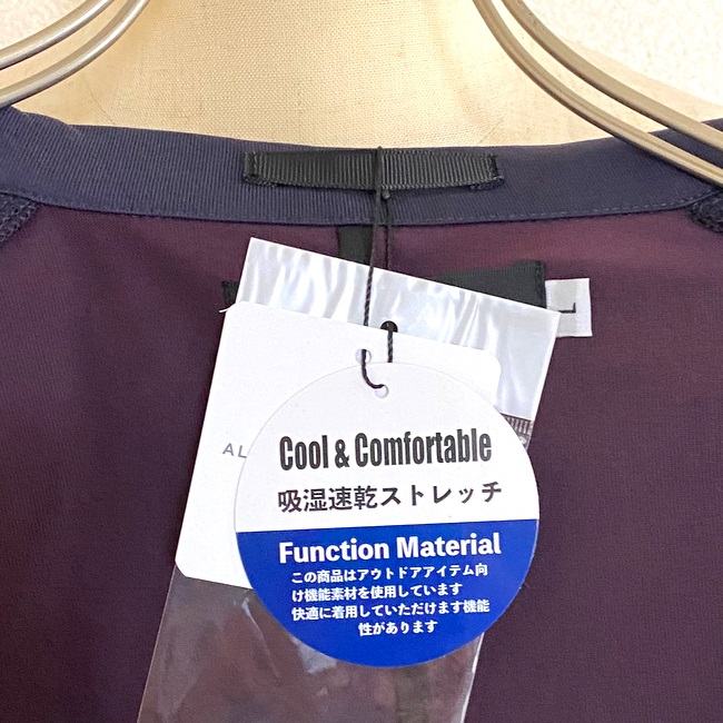 表面は天然素材の綿糸、裏面は吸汗性を高める為にポリエステル糸が現れ、ファッションとしての天然素材な見え方と機能性と両立させています。